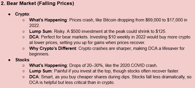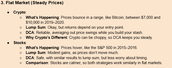 - Stocks: Slower cycles (bull runs: 5–10 years). Lump sum suits long stock uptrends, while DCA fits crypto’s volatility.